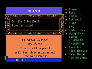 Notes: One of the cooler ones. Shows instruments on right side with which one is active at any given time. Guitar chords and lyric in box on left.